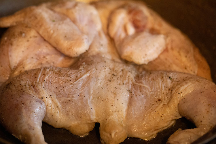 - Ставим сковороду на огонь, наливаем масло, разогреваем его. Выкладываем цыпленка внутренней стороной вниз.