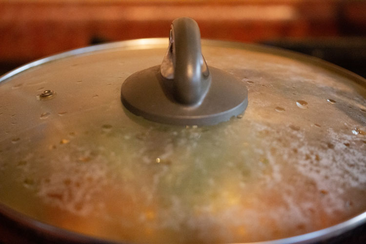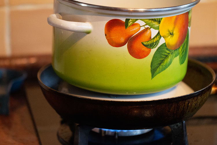 - Если у вас тапак, то накрываем цыпленка, если нет, то закрываем его тарелкой, чуть меньшего диаметра сковороды, и сверху кладем груз (можно поставить кастрюлю с водой)