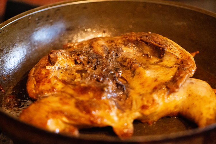 - Цыпленок подрумянился и со второй стороны, снова переворачиваем его внутренней стороной вниз. Поливаем соусом сверху, закрываем сковороду крышкой и тушим еще 8 минут.