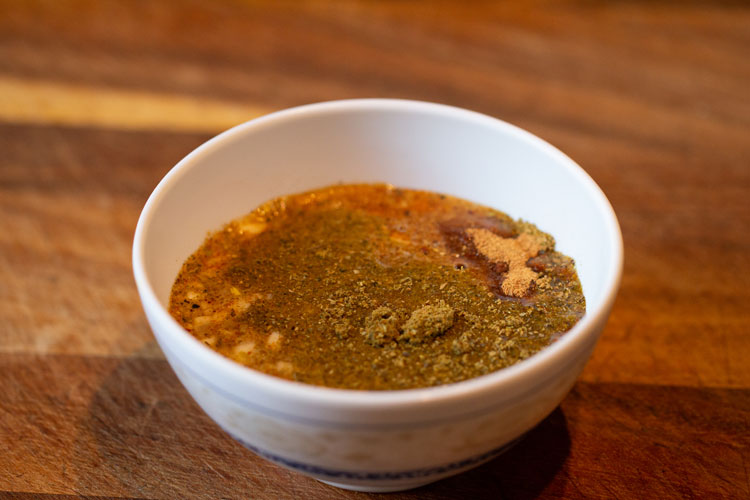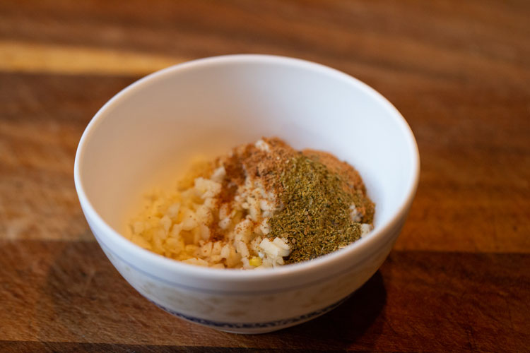 - В чашку высыпаем порубленный чеснок, паприку, хмели-сунели и щепотку соли.