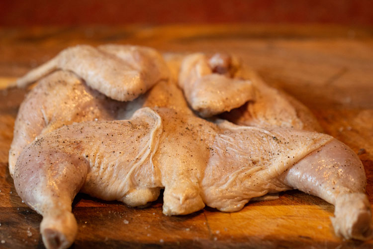 - Тушку цыпленка разрезаем вдоль грудки, натирает смесью соли и перца с обеих сторон.
