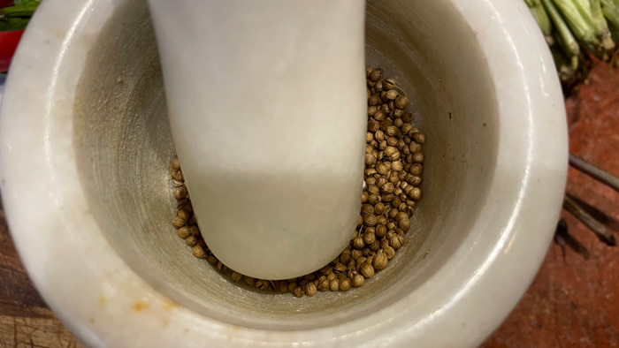 - В ступке перетрем в порошок семена кориандра.