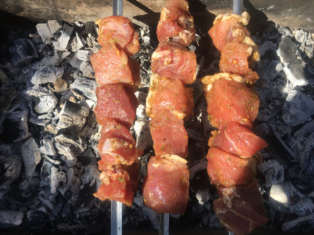 - Разравниваем угли в мангале и выкладываем на мангал шампуры с мясом.