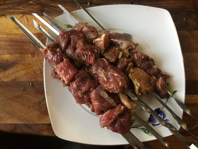 - Прошло время маринования. У нас уже готов мангал с раскаленными углями. Самое время нанизать мясо на шампуры.