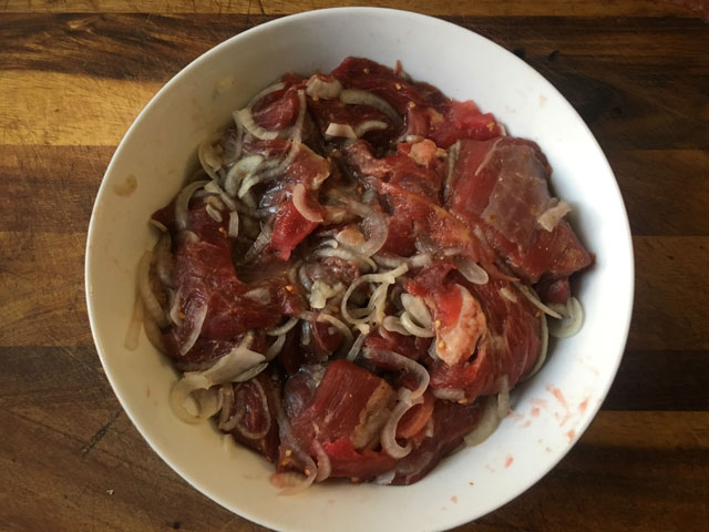 - Берем хороший кусок говяжьей вырезки, хорошо промываем. Очищаем от сухожилий, нарезаем кусками по 40-50 гр. Укладываем все в керамическую или фарфоровую чашку. Солим , перчим, добавляем туда же нарезанный полукольцами лук и листики лаврового листа. Хорошо перемешиваем все стараясь раздавить лук, чтоб сок из него выходил в мясо. Заливаем винный уксус. еще раз хорошо перемешиваем. В принципе это все, мясо замариновано, но для этого рецепта оно должно мариноваться сутки. Если у вас нет столько времени можно порезать 4 помидора и раздавить их прям в мясо. Томаты ускорят процесс маринования. Но не кладите их если будет мариновать сутки. Так же при желании можно добавить и любимую вами зелень, или специи. Но поверьте даже в таком варианте мясо получается очень ароматным и вкусным.