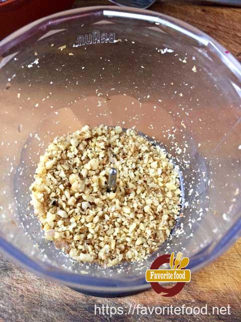 • Грецкие орехи измельчаем в миксере или кофемолке, но не в порошок, а чтоб вкус орехов ощущался во время еды. Измельченные грецкие орехи добавляем к свекле.