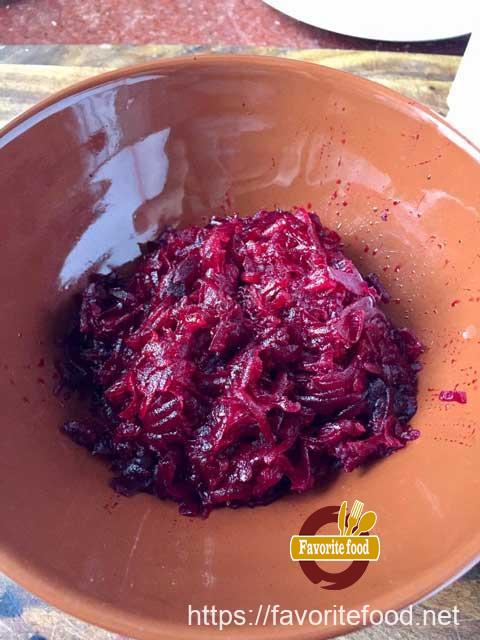• Отвариваем свёклу, чистим её, нарезаем мелкими кубиками или натираем на крупной тёрке.