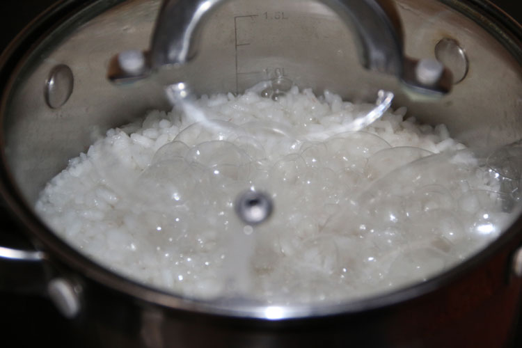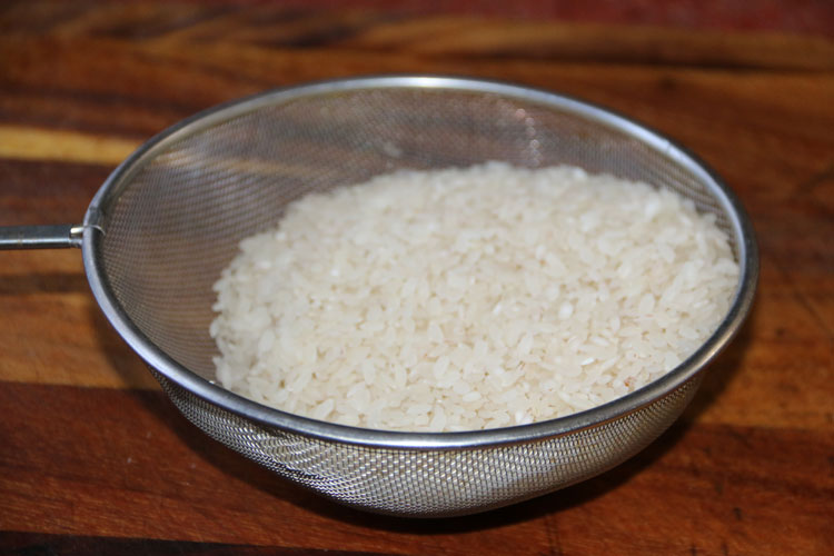 Если мы хотим получить рассыпчатый рис, очень важно как можно лучше промыть его. Только так можно смыть весь крахмал, который и склеивает рисинки. В идеале вода стекающая после промывки риса должна быть прозрачная.