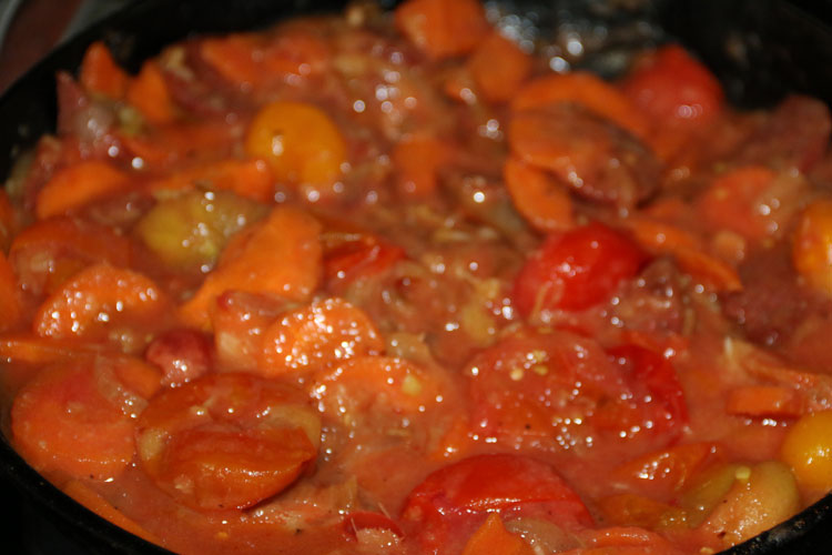 - Добавляем оставшуюся муку, все перемешиваем и высыпаем помидоры. Еще раз все хорошо перемешиваем. Доводим до кипения и снимаем с огня.