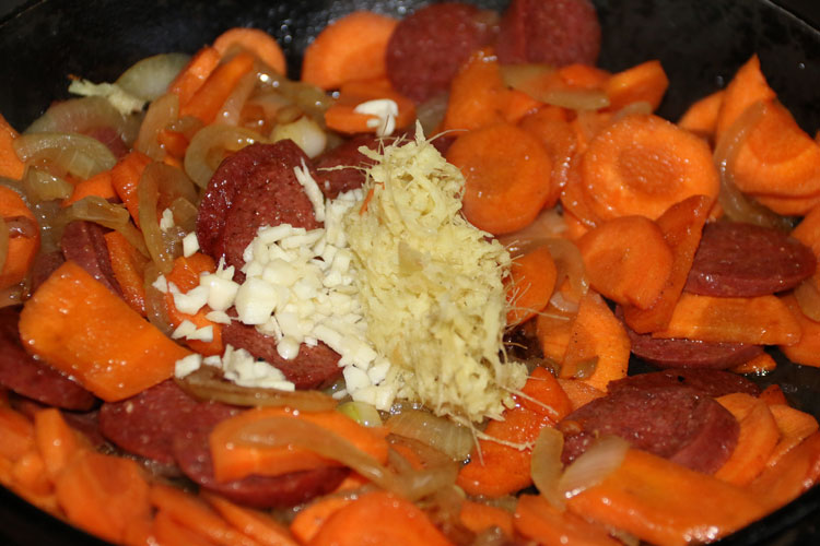 - Добавляем чеснок и имбирь. Жарим еще минут 5