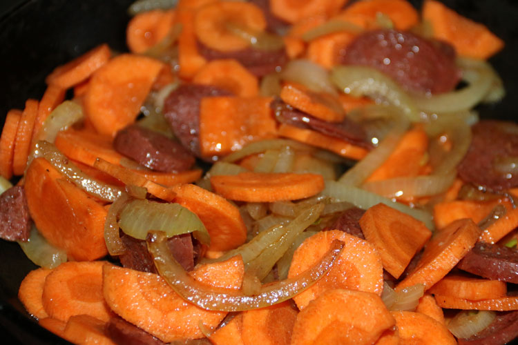 - Цыпленка уберем со сковороды пока в сторону. А в сковороду опустим нарезанный полукольцами лук, колбаску и морковь. Обжарим все минуты 3-4