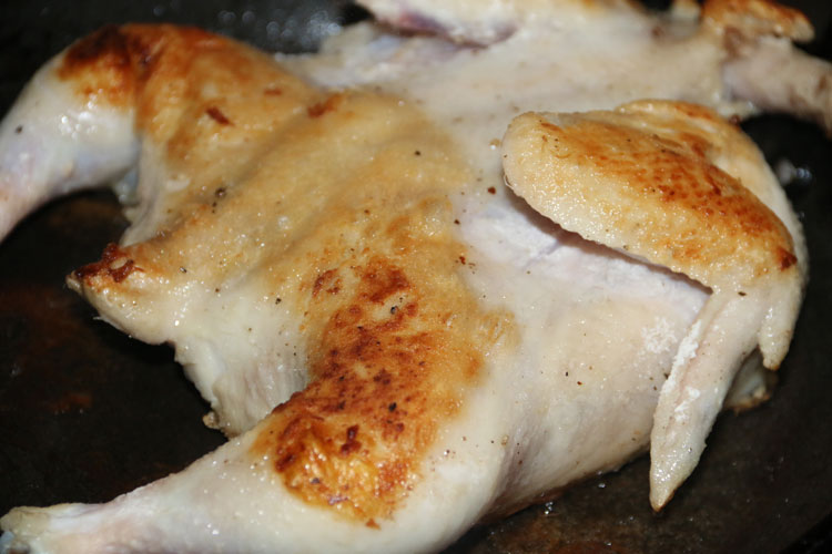 - Разогреваем сковороду с маслом. И обжариваем цыпленка, чтоб стал немного румяным. Перевернем его и подрумяним с другой стороны тоже.