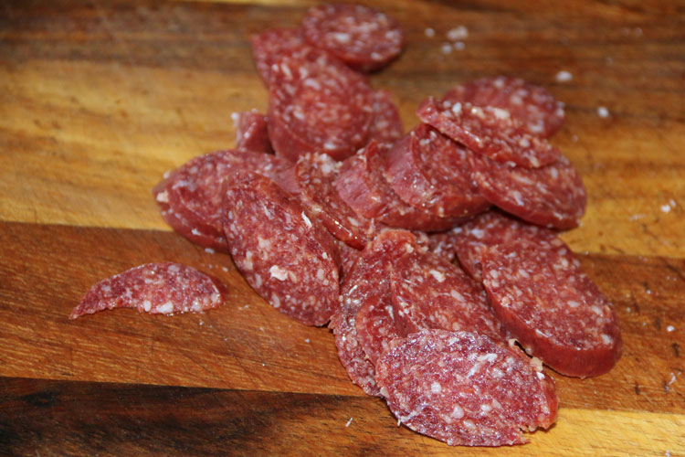 - Приготовим все ингредиенты. Нарежем колбаску.