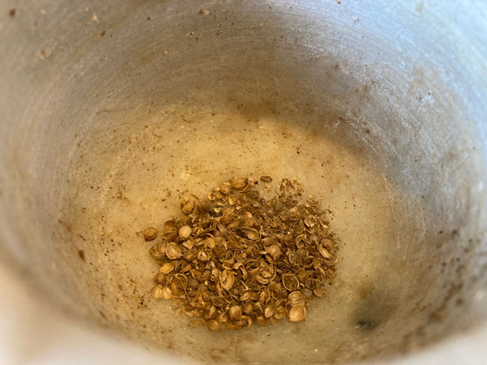 - Кориандр измельчаем в ступке, если он у вас в зернах, как у меня.