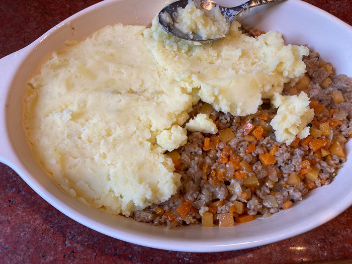 - Следующим слоем идет картофельное пюре, пока оно горячее. Разравниваем второй слой.