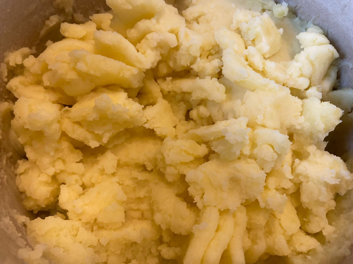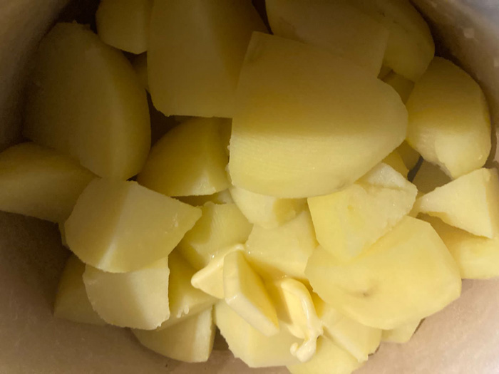 - К этому моменту картофель сварился. Сливаем с него воду, но не полностью, оставим около 100-150 мл отвара. Добавляем в картофель сливочное масло.