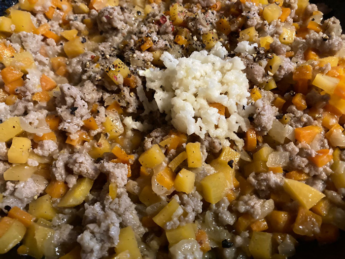 - Прошло 10 минут, открываем крышку сковороды и выдавливаем чеснок через чеснокодавку. Перемешиваем. Обжариваем минут 5.