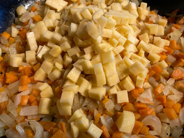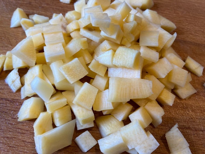 - Брюкву моем, чистим, нарезаем кубиками.
