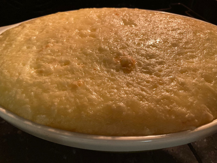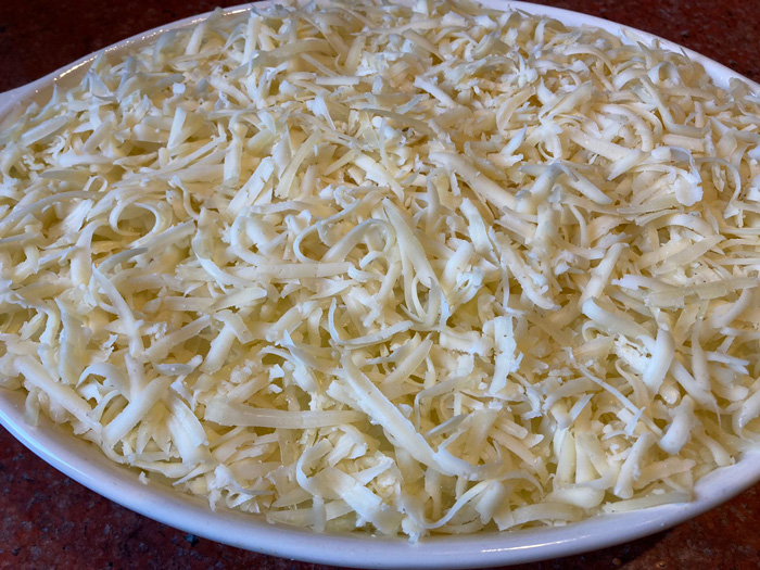 - Посыпаем натертым сыром ровным слоем картофельное пюре. Отправляем заполненную форму для запекания в разогретую духовку на 30 минут.