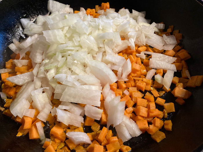 - Всыпаем нарезанный лук в сковороду к моркови.