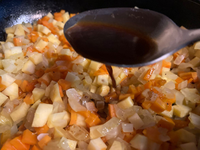 - Измельченный кориандр добавляем к овощам, а также солим, перчим, вливаем столовую ложку Вустерского соуса (если его нет в наличии, то можно обойтись и без него, он просто придает свои нотки блюду). Перемешиваем.