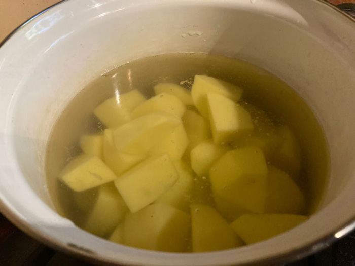 - Для начала чистим и моем картофель, режем его на 4-6 частей и ставим вариться в подсоленной воде.