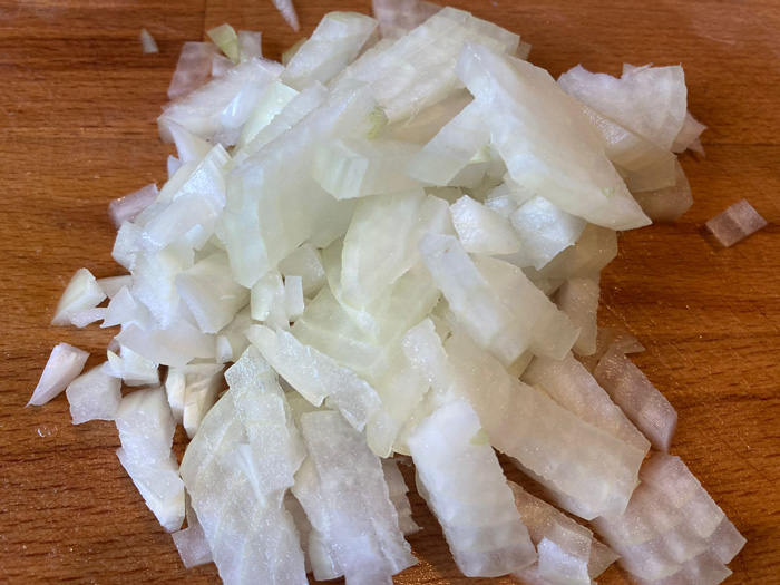 - Лук очищаем от шелухи и режем кубиками.