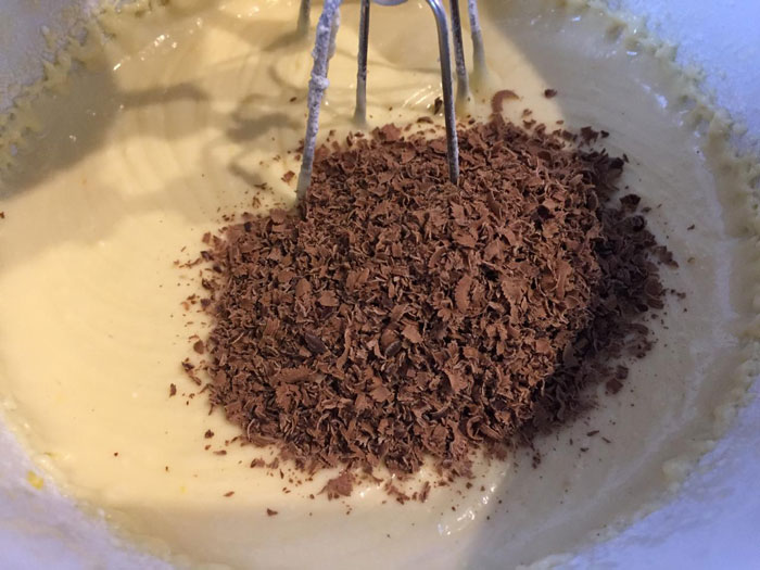 • В получившееся тесто всыпаем натертый шоколад и аккуратно перемешиваем. Тесто готово.