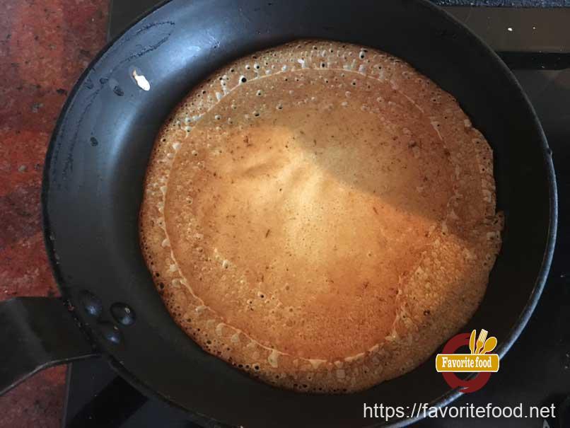 • Ждем когда края блина подрумянятся, значит пришло время перевернуть блин.
