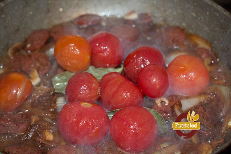 - Добавляем помидоры , лавровый лист и херес. Доводим до кипения.