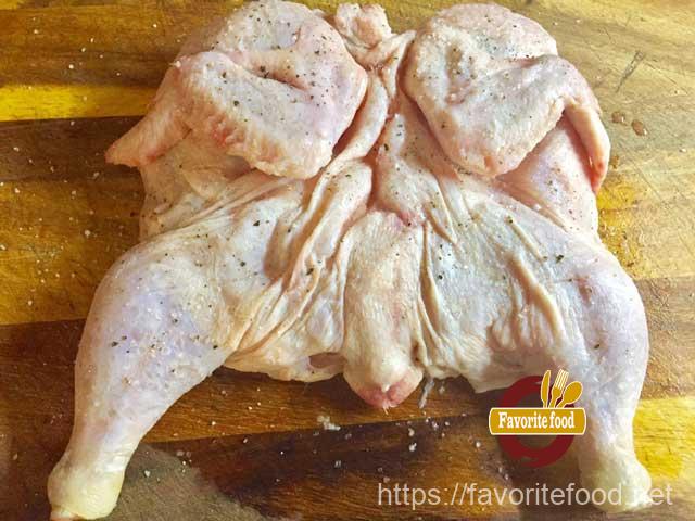 - Цыпленка моем, разрезаем по грудке и расплющиваем его, чтоб цыпленок принял как можно более плоскую форму.Натираем цыпленка солью и чёрным перцем со всех сторон.