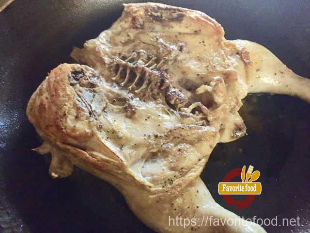 - На сковороду, по размеру цыпленка, наливаем растительное масло, ставим сковороду на огонь, разогреваем масло. Кладем цыпленка внутренней стороной вниз и обжариваем 5 минут на сильном огне, чтоб получить румяную корочку, затем переворачиваем цыпленка на спинку (аккуратно, будут брызги горячего масла при переворачивании) и обжариваем еще 5 минут.