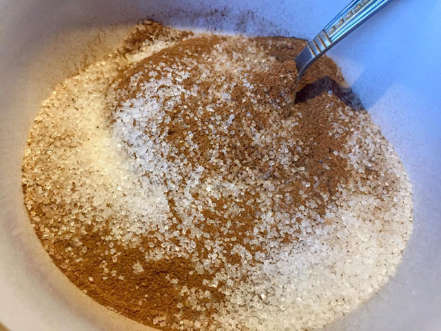 - Пока тесто поднимается, подготовим начинку. В отдельной миске смешиваем 120 г сахара и 20 г корицы.