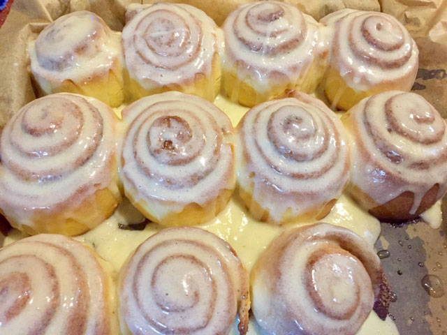 - Пока булочки горячие, равномерно поливаем их крем-глазурью. Все готово! Пора к столу, от ароматов из кухни-слюнки текут. Синабон вкусны как в горячем виде, так и остывшими (если, конечно, они успеют остыть).
