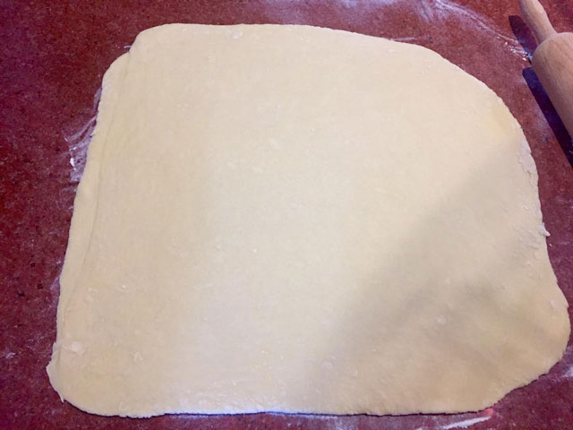 - Складываем раскатанное тесто вдвое по длине, а затем, сложенный вдвое пласт теста, складываем втрое. Накрываем получившийся квадрат из теста чистым полотенцем и оставляем отдохнуть и подняться на 20 минут.