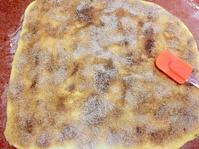 - Равномерно посыпаем раскатанное тесто смесью сахара и корицы, прижимая смесь, чтоб она прилипла к маслу.