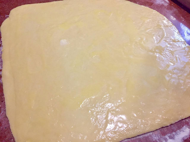 - Смазываем растопленным сливочным маслом (60 г) получившийся пласт теста.