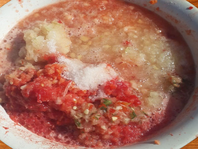 - Теперь все пропускаем через мясорубку или измельчаем блендером. Смешаем все измельченные, кроме огурцов конечно, овощи. Добавим туда же 200 гр. сахара и 2 столовые ложки, с горкой, соли.