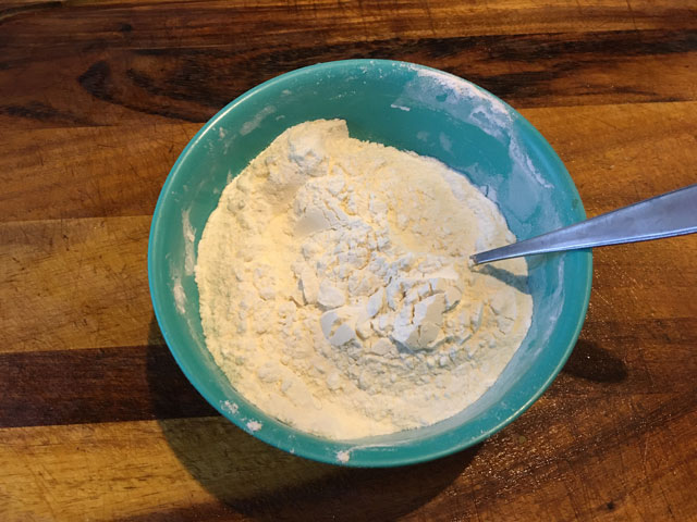 - Смешаем в миске муку, крахмал, соль, перец и разрыхлитель. Хорошо все перемешаем .