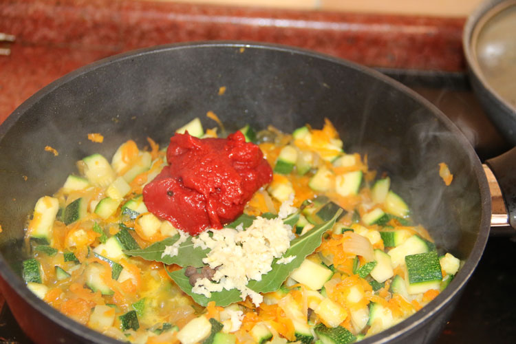 - Добавим томатную пасту, чеснок (пропущенный через чеснокодавку), душистый перец и лавровый лист.