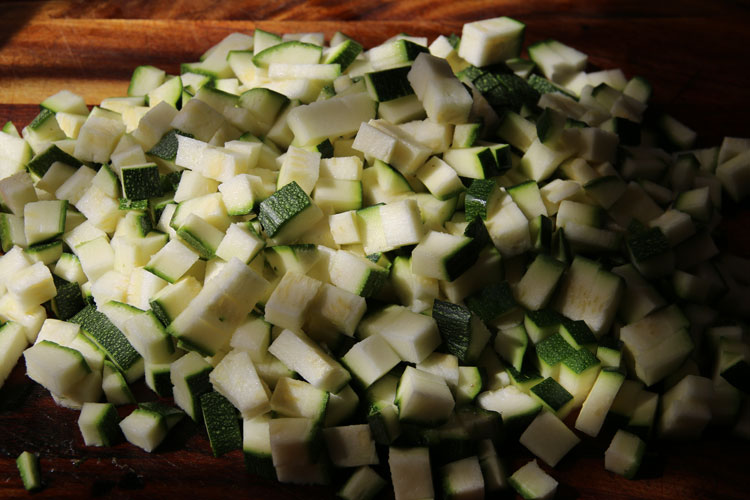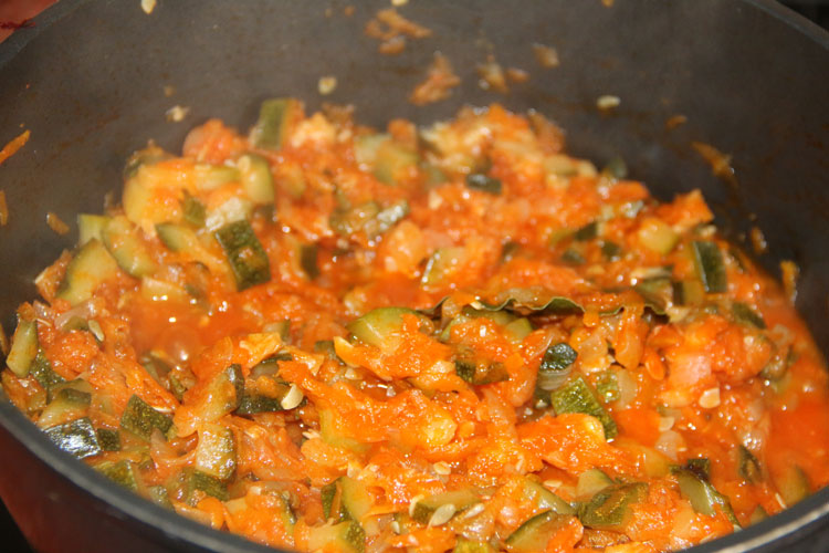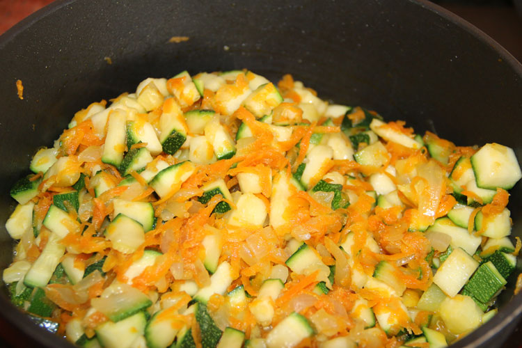 - Следом в кастрюлю отправляем кабачки. Немного посолим. Овощи тогда быстрее дадут сок. Обжарим все еще минут 9
