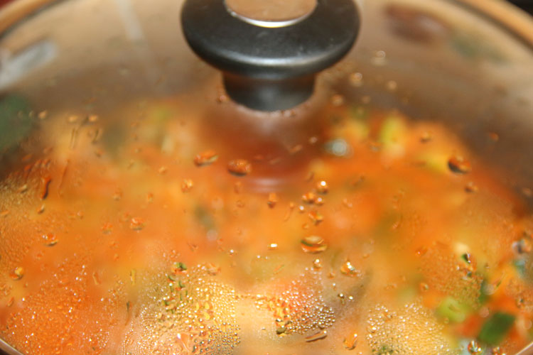 - Хорошо перемешаем все, убавим огонь до минимального. Закроем крышкой и будем тушить минут 30. Изредка не забывая помешивать.