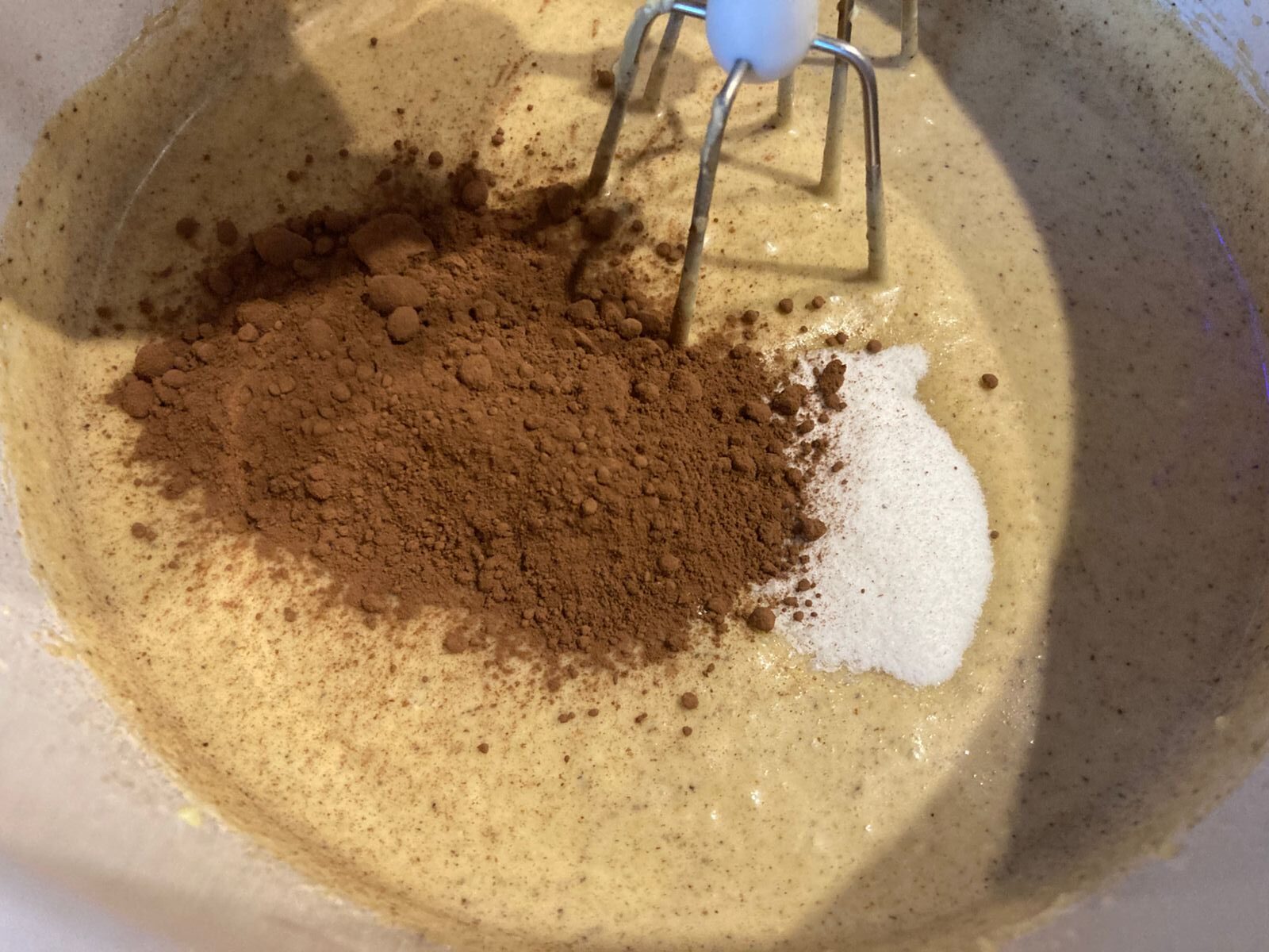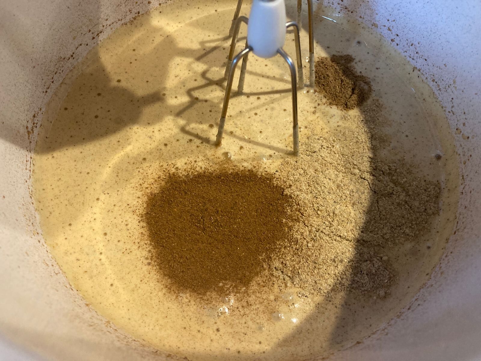 - Всыпаем корицу, кардамон и имбирь. Снова перемешиваем миксером.