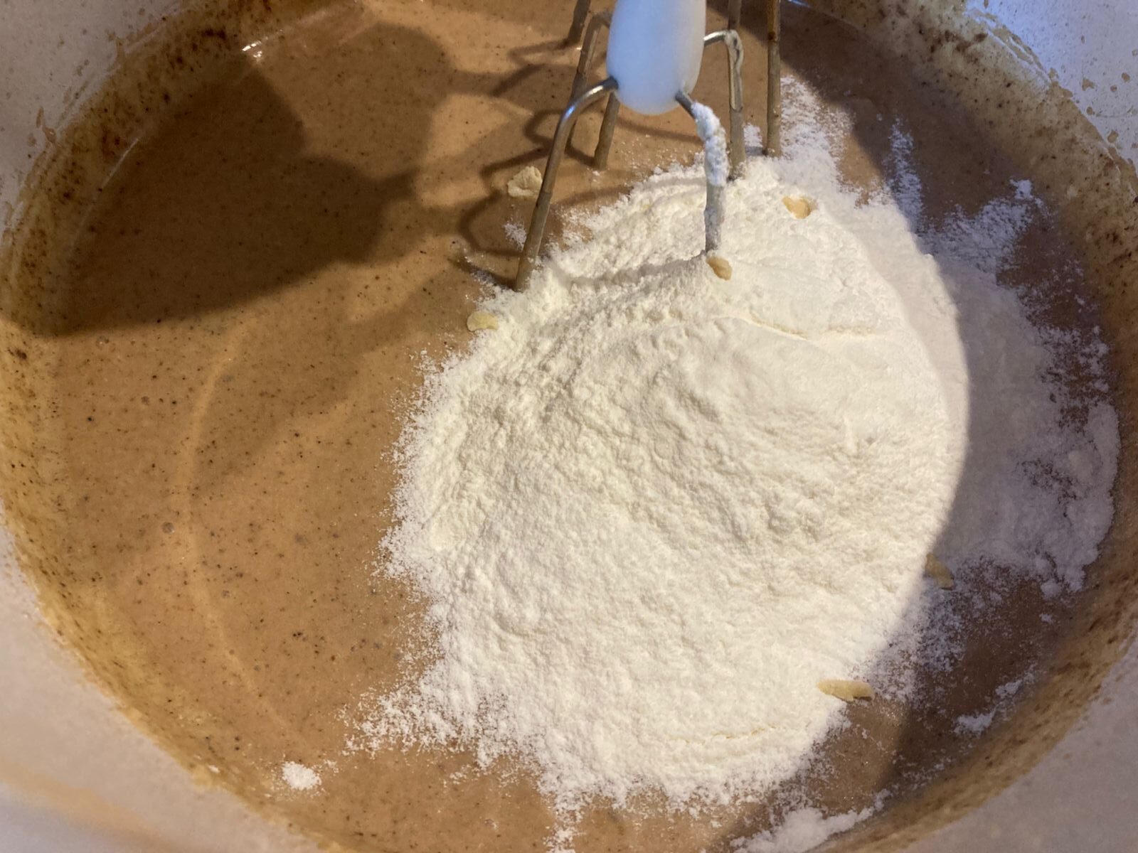 - Теперь постепенно начинаем вводить муку, не останавливая миксера. Муки может потребоваться чуть больше или чуть меньше, это зависит от размера яиц, которые Вы использовали.