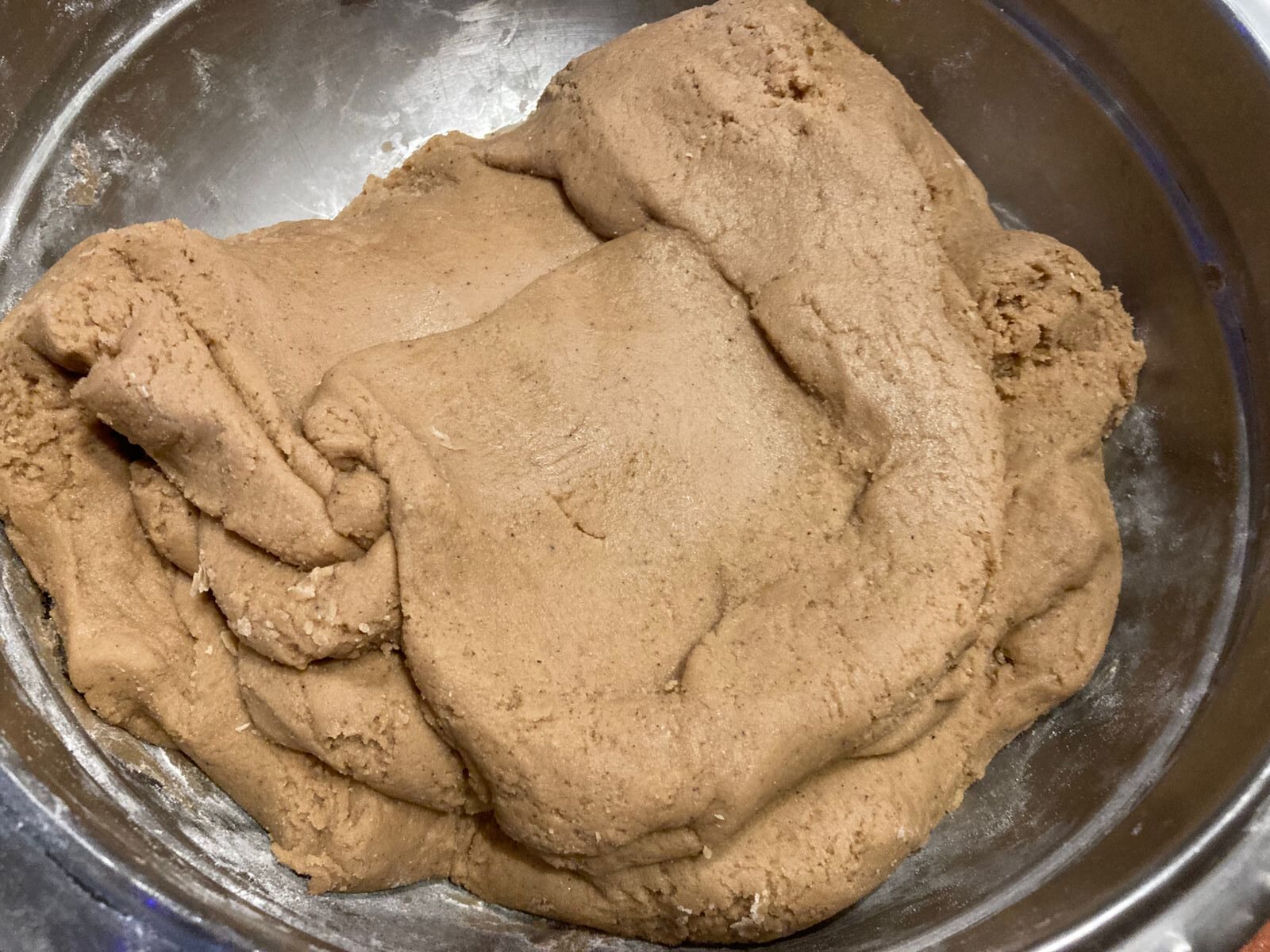 - Мой миксер не особо мощный, поэтому не может вымешать густое тесто. Поэтому, когда вижу, что миксер не справляется, выкладываю тесто в глубокую миску и вмешиваю остаток муки вручную, до момента, когда тесто перестает липнуть к рукам и станет однородным.