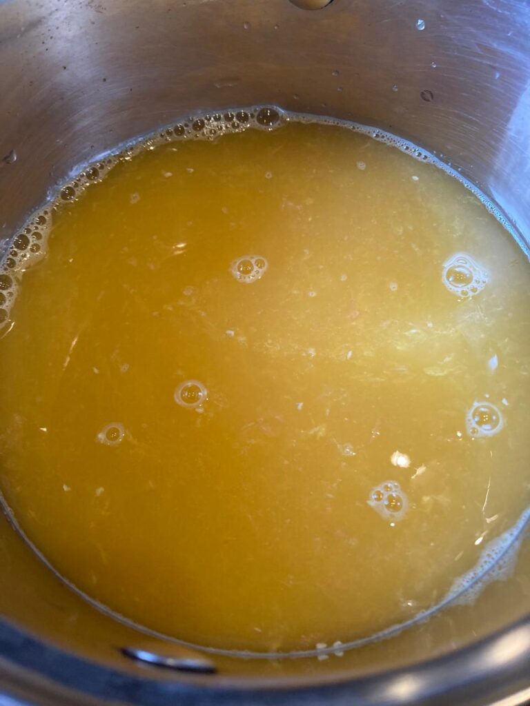 - В кастрюльку вливаем 100 мл воды, в воду всыпаем 2 ч.л. агар-агара и 100 г сахара (количество сахара можно варьировать, если хочется послаще – увеличьте количества сахара, покислее – уменьшите). Ставим кастрюльку на огонь, чтоб агар-агар и сахар растворились, но не доводим до кипения! В получившийся сироп вливаем апельсиновый сок. Доводим до кипения и, на слабом огне, провариваем получившуюся смесь 2-3 минуты, постоянно помешивая и не допуская бурного кипения. Выключаем огонь и разливаем смесь по формам, в формы, при желании, можно добавить кусочки различных фруктов или ягод. Апельсиновое желе с агар-агаром готово. Формы отставляем остывать при комнатной температуре. После остывания желе можно кушать, а оставшееся желе, можно убрать в холодильник.