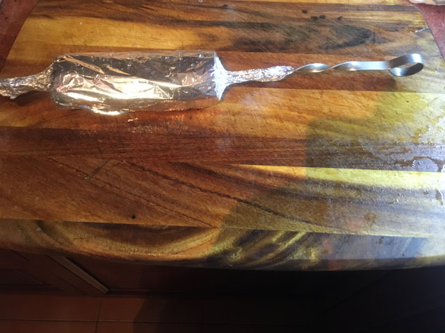• А дальше хорошо завернем все в фольгу, замотав края на шампур. Получиться вот так.