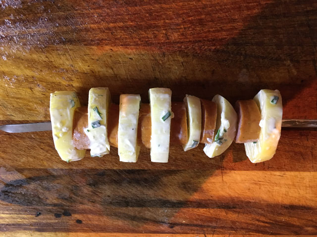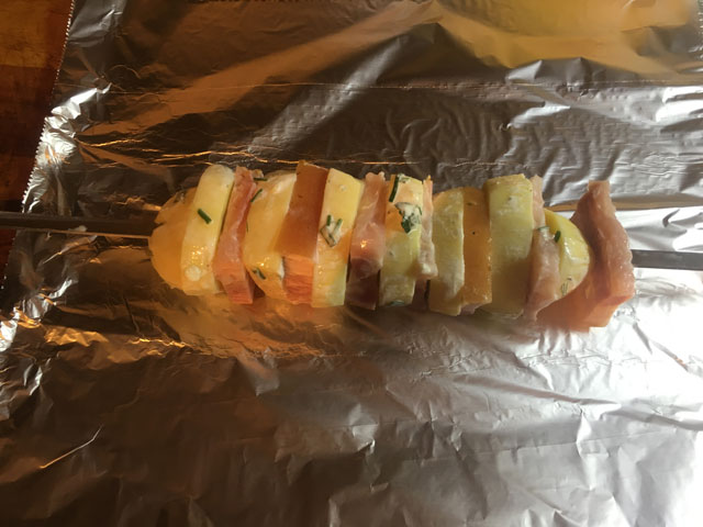 • Далее оторвем кусок фольги немного шире нанизанного на шампур. Растелим фольгу на стол , положим сверху наш шампур. завернем его слегка и польем соусом в котором солился картофель.