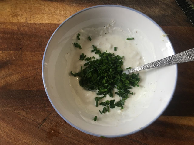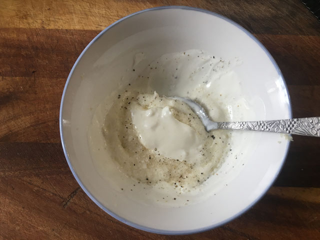 • В миске смешаем сметану, пропущенный через чеснокодавку чеснок, соль и перец. Солим добавим чуть больше, чтоб соус был немного пересоленным. В последствии картофель заберет лишнюю соль.