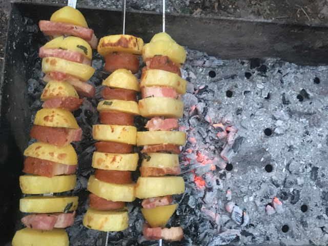 • Подготовленные таким образом шампуры с картофелем, выкладываем на мангал. Над раскаленными углями.